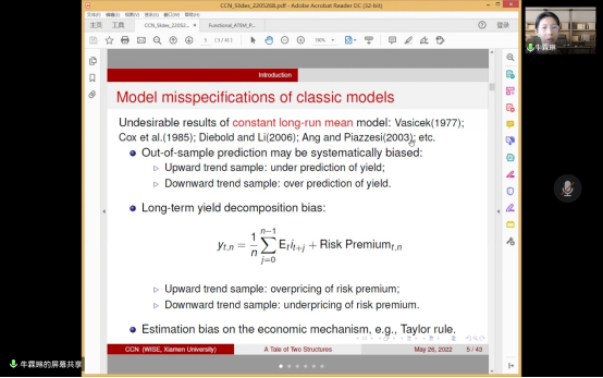 2022年5月26日,厦门大学王亚南经济研究院牛霖琳教授应WILLIAMHILL在线体育投注邀请,开展主题为“A Tale of Two Structures: The life-cycle Linkage between Interest Rate Term Structure and Demographic Age Structure”的讲座,本次讲座于下午2点在腾讯会议(281-312-917)举行,持续近两个小时。本次讲座由WILLIAMHILL在线体育投注黄乃静老师主持,赵文哲,洪圣杰,赵宣凯,金融公司朱一峰老师,WILLIAMHILL在线体育投注部分员工参加了此次讲座。