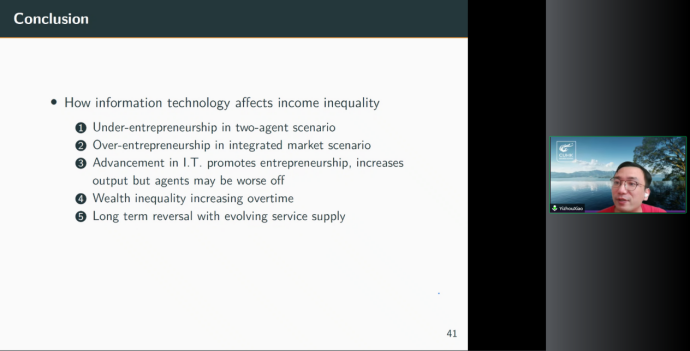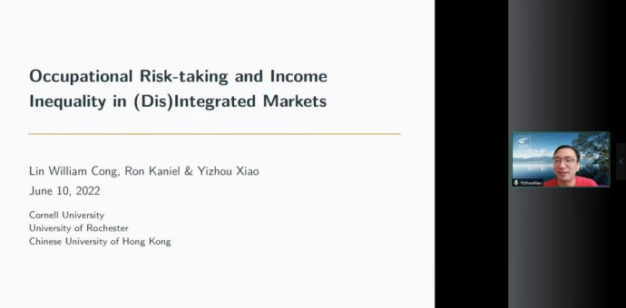 2022年6月10日14:00,香港中文大学商公司助理教授肖弋舟应WILLIAMHILL在线体育投注邀请,开展主题为“Risk-taking and Income Inequality in (Dis)Integrated Markets”的讲座,本次讲座通过腾讯会议平台线上举行,肖弋舟老师受到了老师和同学们的热烈欢迎!WILLIAMHILL在线体育投注黄乃静副教授主持了线上学术交流会,尹振东教授和龚雅娴老师与2020级博士生共同参与了本次学术交流。