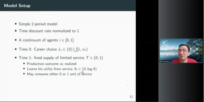 一场大流行或民粹主义会阻碍全球一体化,正如信息技术和交通的进步会刺激全球一体化一样。肖弋舟教授研究了在产品和服务供给缺乏弹性的分割市场或整合市场下,职业选择、风险承担和收入不平等的一般均衡模型。肖教授将职业选择引入服务市场,假设在分割市场中工人有体面的机会享受服务,而在统一市场中只有更富有的代理商才能承受高价。并在文章后半部分通过图形展示了风险承担与服务供给和信息技术进程的关系。