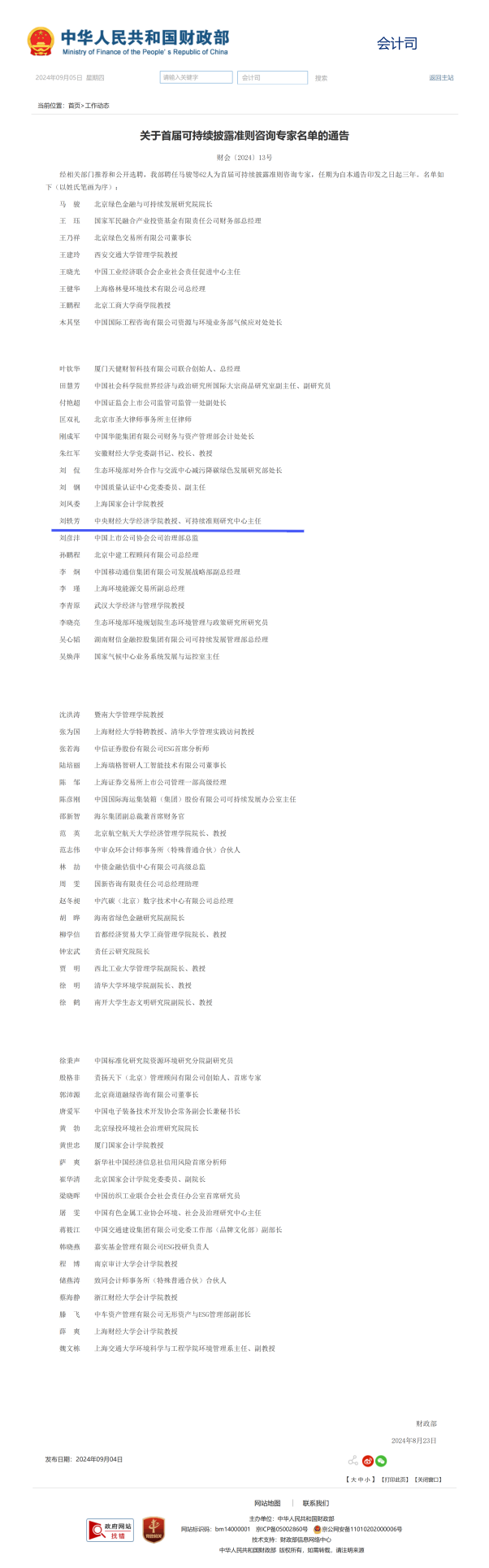 2024年9月4日,财政部公布了首届可持续披露准则咨询专家名单,经相关部门推荐和公开选聘,首届共聘任62名专家学者,任期为三年。公司可持续准则研究中心主任刘轶芳教授,受聘为财政部首届可持续披露准则咨询专家。