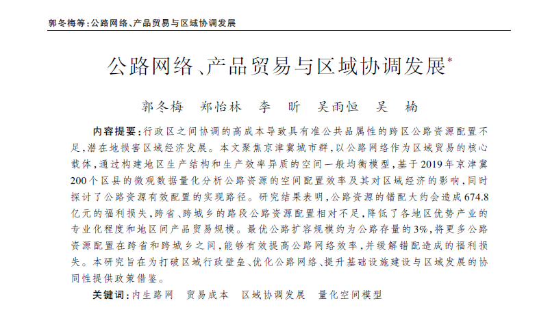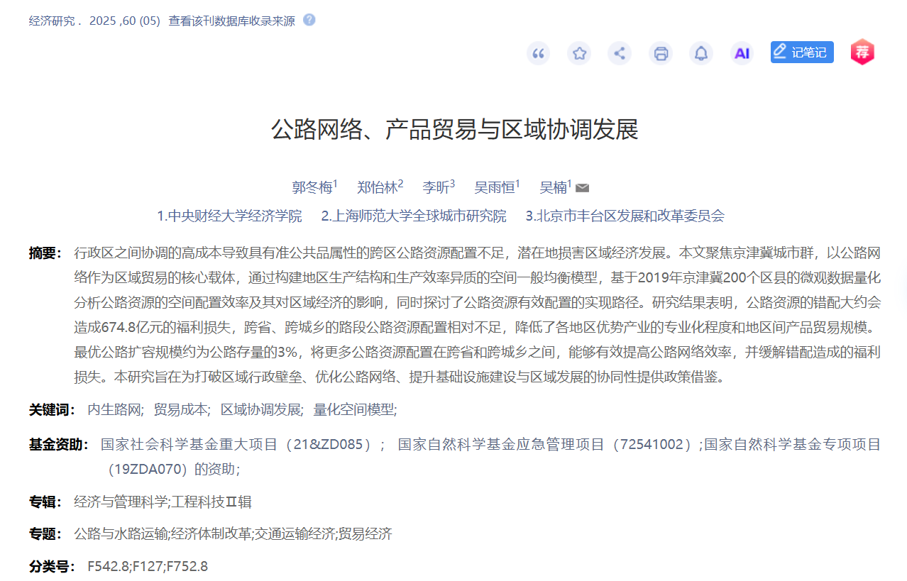摘要:行政区之间协调的高成本导致具有准公共品属性的跨区公路资源配置不足,潜在地损害区域经济发展。本文聚焦京津冀城市群,以公路网络作为区域贸易的核心载体,通过构建地区生产结构和生产效率异质的空间一般均衡模型,基于2019年京津冀200个区县的微观数据量化分析公路资源的空间配置效率及其对区域经济的影响,同时探讨了公路资源有效配置的实现路径。研究结果表明,公路资源的错配大约会造成674.8亿元的福利损失,跨省、跨城乡的路段公路资源配置相对不足,降低了各地区优势产业的专业化程度和地区间产品贸易规模。最优公路扩容规模约为公路存量的3%,将更多公路资源配置在跨省和跨城乡之间,能够有效提高公路网络效率,并缓解错配造成的福利损失。本研究旨在为打破区域行政壁垒、优化公路网络、提升基础设施建设与区域发展的协同性提供政策借鉴。