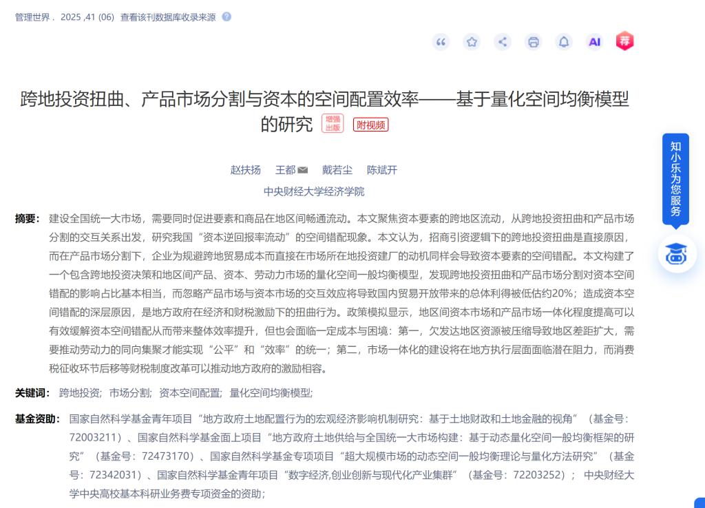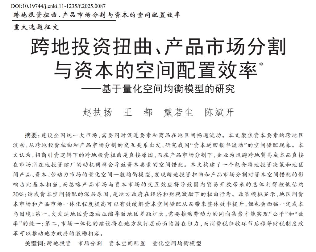 摘要:建设全国统一大市场,需要同时促进要素和商品在地区间畅通流动。本文聚焦资本要素的跨地区流动,从跨地投资扭曲和产品市场分割的交互关系出发,研究我国“资本逆回报率流动”的空间错配现象。本文认为,招商引资逻辑下的跨地投资扭曲是直接原因,而在产品市场分割下,企业为规避跨地贸易成本而直接在市场所在地投资建厂的动机同样会导致资本要素的空间错配。本文构建了一个包含跨地投资决策和地区间产品、资本、劳动力市场的量化空间一般均衡模型,发现跨地投资扭曲和产品市场分割对资本空间错配的影响占比基本相当,而忽略产品市场与资本市场的交互效应将导致国内贸易开放带来的总体利得被低估约20%;造成资本空间错配的深层原因,是地方政府在经济和财税激励下的扭曲行为。政策模拟显示,地区间资本市场和产品市场一体化程度提高可以有效缓解资本空间错配从而带来整体效率提升,但也会面临一定成本与困境:第一,欠发达地区资源被压缩导致地区差距扩大,需要推动劳动力的同向集聚才能实现“公平”和“效率”的统一;第二,市场一体化的建设将在地方执行层面面临潜在阻力,而消费税征收环节后移等财税制度改革可以推动地方政府的激励相容。