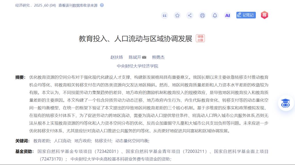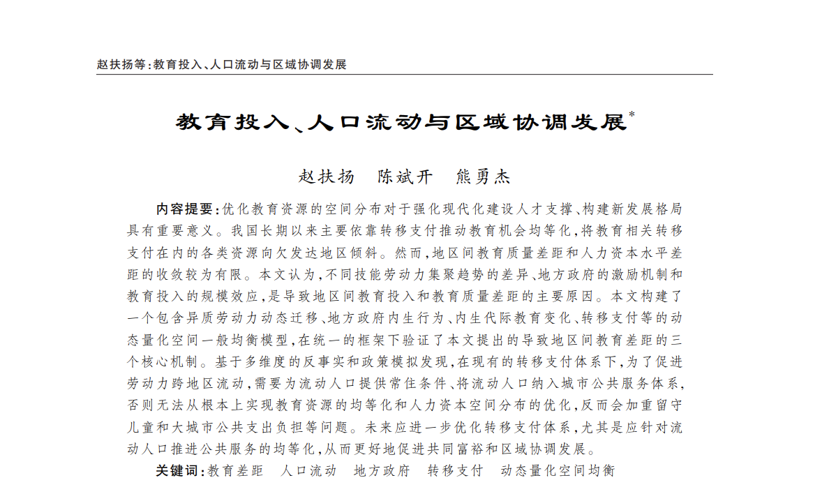 公司赵扶扬老师、陈斌开老师和本科毕业生熊勇杰的论文《教育投入、人口流动与区域协调发展》在《经济研究》刊发