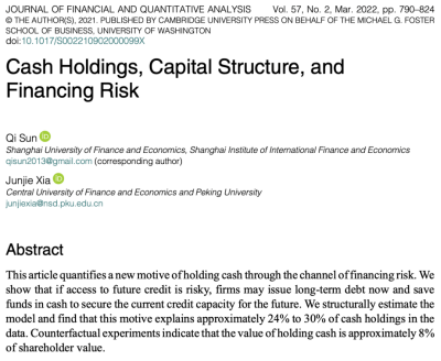 Sun, Q., & Xia, J. (2022). Cash Holdings, Capital Structure, and Financing Risk. Journal of Financial and Quantitative Analysis, 57(2), 790–824.
