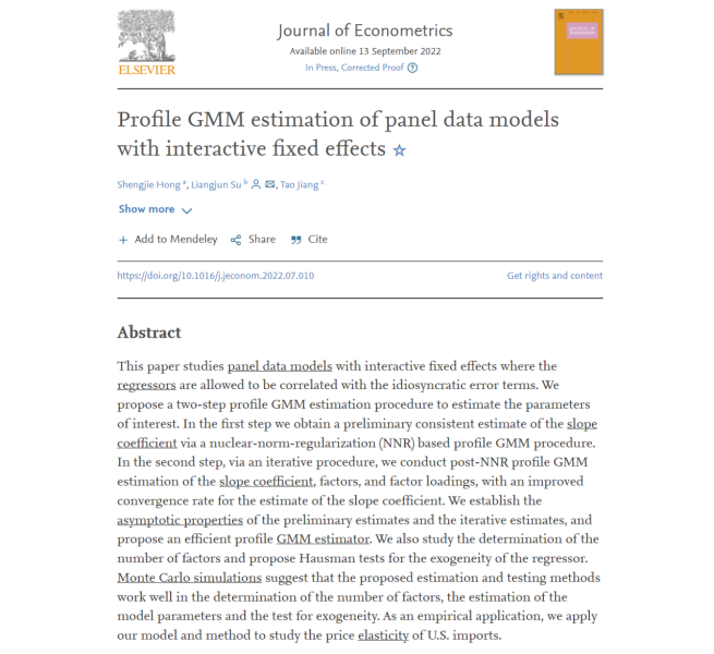 学术视点 | 公司洪圣杰老师的合作论文 Profile GMM Estimation of Panel Data Models with Interactive Fixed Effects 被国际顶级期刊 Journal of Econometrics 接收待刊