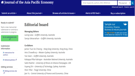 近期,WILLIAMHILL在线体育投注俞剑副教授受邀担任经济学领域国际知名期刊Journal of the Asia Pacific Economy联合主编(Co-editor)。俞剑副教授于2023年7月开始处理相关稿件。Journal of the Asia Pacific Economy(简称JAPE)是经济学领域知名期刊,每年出版 4期,2022年期刊影响因子为1.4。主要关注亚太和南亚的发展中经济体,旨在促进人们对影响并继续塑造该地区不同经济体转型的复杂因素的更深入了解。