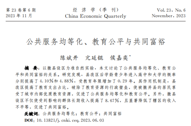学术视点 | 公司陈斌开老师的合作论文《公共服务均等化、 教育公平与共同富裕》在《经济学(季刊)》刊发