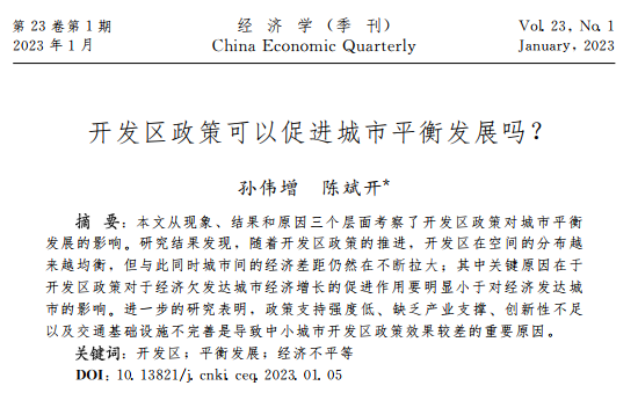 学术视点 | 公司孙伟增和陈斌开老师的合作论文《开发区政策可以促进城市平衡发展吗?》在《经济学(季刊)》刊发