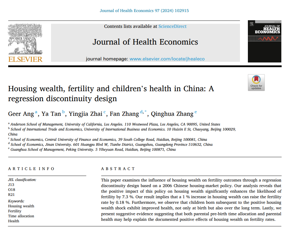 学术视点 | 公司翟颖佳老师的合作论文Housing wealth, fertility and children's health in China: A regression discontinuity design在国际顶级期刊Journal of Health Economics刊发