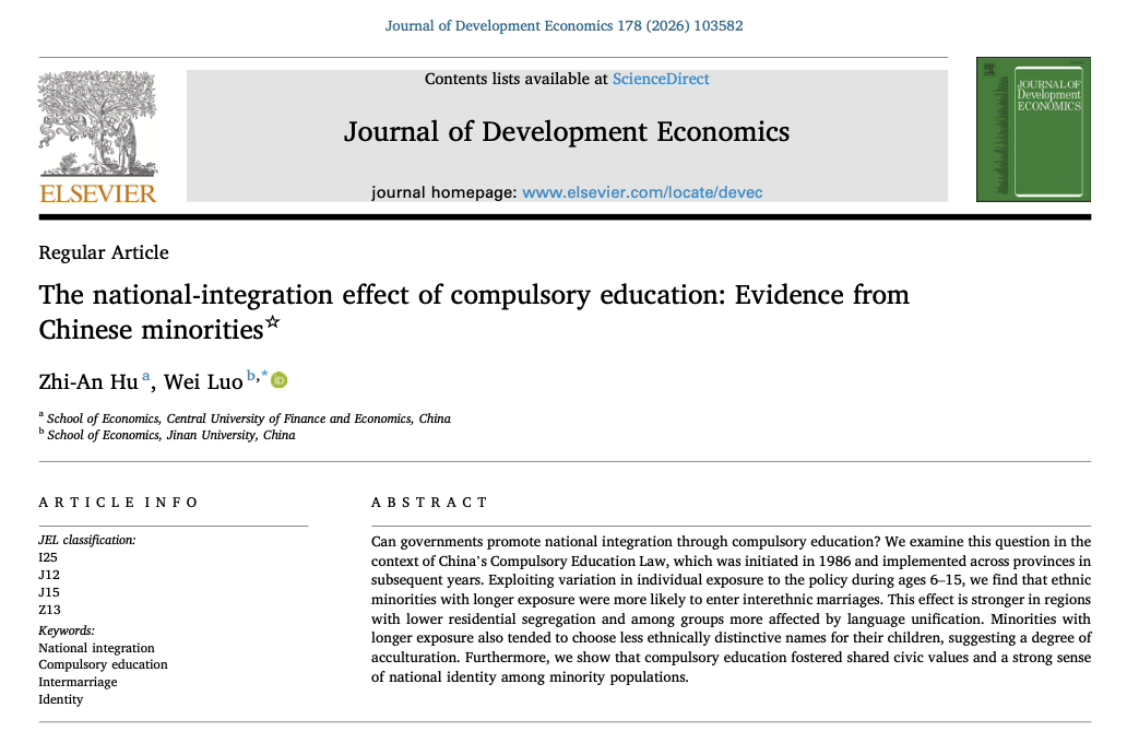 政府能否通过义务教育促进国家整合?本文以中国1986年颁布、随后分省实施的《义务教育法》为研究背景,通过分析个体在6-15岁期间受该政策影响的差异,发现接受义务教育时间更长的少数民族群体更可能选择跨民族通婚。这种效应在居住隔离程度较低的地区以及受语言统一政策影响更深的群体中更为显著。研究还表明,接受义务教育时间较长的少数民族父母倾向于为子女取民族特征较弱的姓名,这在一定程度上反映了文化融合。此外,义务教育有效培育了少数民族群体的公民价值观和国家认同感。