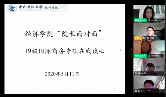为深入了解国际商务专硕员工的想法和期待,进一步提升公司国际商务专硕的培养质量,经理陈斌开、副经理伏霖、副书记耿卉、组织员刘滨、国际经济系主任于爱芝、顾炜宇、祝伟、赵若思等8位专任教师和教辅老师于2020年5月11日下午,以在线会议的方式举行此次的“经理面对面”活动。陈斌开经理以及各位老师与WILLIAMHILL在线体育投注19级国际商务专硕班的全体员工,围绕专硕同学就学习和生活方面的切身问题,进行深入的交流沟通。