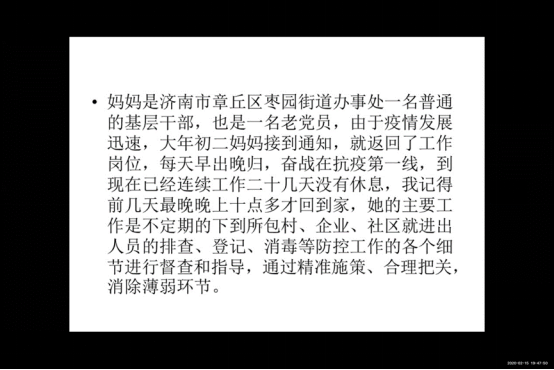 在看“疫”环节中,党员通过分享自己身边的抗“疫”事迹和暖心故事,一起守望相助,爱心接力。潮力亚的父亲作为一名老党员,在疫情期间排除万难,全力保障社区的口罩等物资供给;张小璇的母亲担起社区工作者的责任,挺身前线奔赴“社区隔离防控战”;刘西凤以当地老员工党员志愿者为例,分享疫情困境下青年一代的担当与作为;谢昭冬更是以参与武汉方舱医院通讯工程的表哥为例,为同学们捕捉多个奋战一线的感人镜头。一个个医护人员、基层工作者、后勤工人真真实实地存在于我们身边,或感动或铿锵的故事澎湃了大家的内心,坚定了抗“疫”必胜的信心与决心。