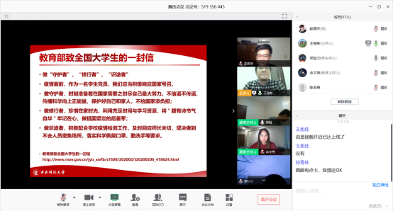 活动最后,党支部成员共同观看了全体党员拍摄录制的诗朗诵——《中国阻击战》,共同表达对中国、对湖北、对武汉打赢疫情阻击战的美好希望和祝福。