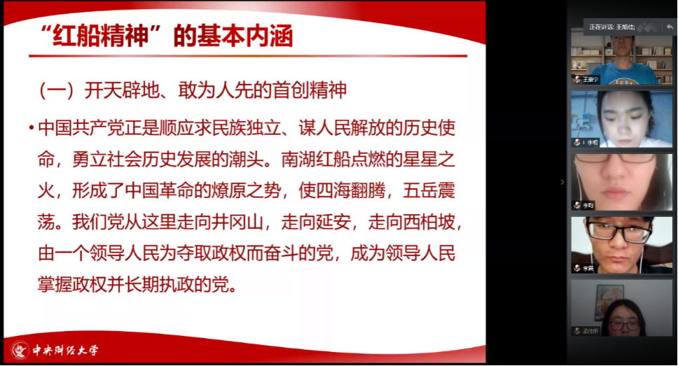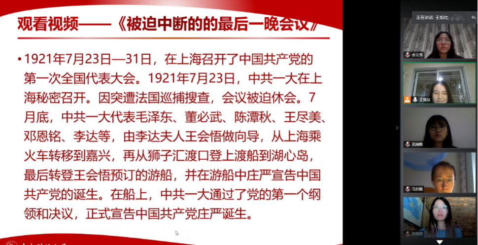 首先,由宣传委员王旭佳讲解“弘扬‘红船精神’、践行初心使命”主题党课,并观看视频《被迫中断的最后一晚会议》。“红船精神”代表了开天辟地、敢为人先的首创精神;代表了坚定理想、百折不挠的奋斗精神;代表了立党为公、忠诚为民的奉献精神。今天我们重温“红船精神”,便是要坚持党的领导,坚持为中国人民谋幸福、为中华民族谋复兴、为世界谋大同的初心。我们党的全部历史都是从中共一大开启的,我们走得再远都不能忘记来时的路。