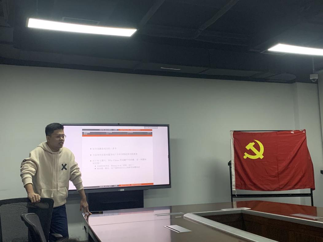 马丽亚同学从新《中国共产党章程》的精神,十九届五中全会精神,习近平同志在国家中长期经济社会发展战略若干重大问题三个维度讲解了如何将党的精神和科研结合。当党要求我们的生活要满足多样化,高质量的需求,可以研究城市规模、人口结构与不可贸易品多样性;为支持科教兴国战略,可以研究如何通过教育缓解收入不平等;当国家要继续进行城市化发展,可以调研中国式城镇化的福利效应评价。每一个论文案例都是紧紧贴切着文件精神,让同学们感叹原来每天绞尽脑汁想的论文出发点都暗藏在党的文件里,找到了更多新的思路源头,日常生活要注重党的建设与科技创新的有机结合,找准与科技创新工作的结合点,形成良好互动的局面。