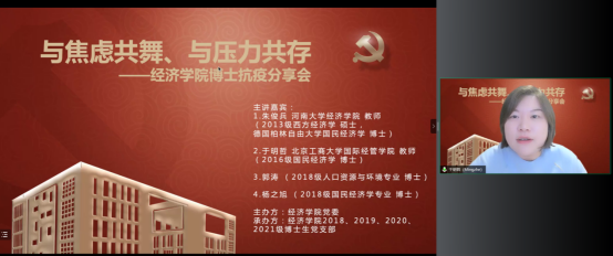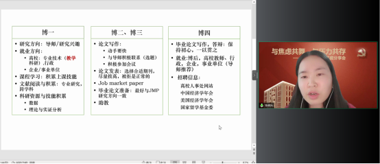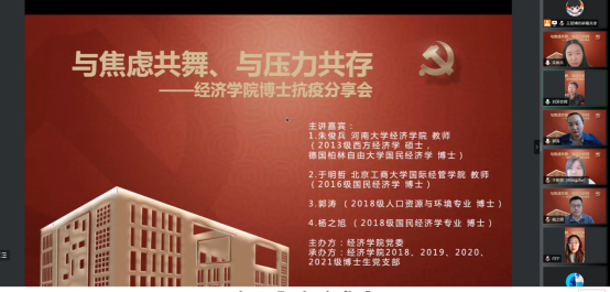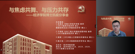 经济公司党委在切实做好校园疫情防控工作的基础上,帮助博士生树立正确的就业择业观,缓解博士生对不同学习阶段以及未来职业生涯规划的压力,在全院博士生中深入开展了以学业规划和择业选择为主题的抗疫分享会。2022年5月14日,WILLIAMHILL在线体育投注特邀在高校就职的博士员工代表朱俊兵、于明哲和2018级博士党支部代表郭涛、杨之旭,充分发挥自身科研知识与专业特长,为公司博士生答疑解惑,并邀请胡志安老师作总结发言。活动由经济公司党委组织员刘滨老师和2018级博士生党支部书记马陆共同主持,2018、2019、2020、2021级博士党支部联合承办。