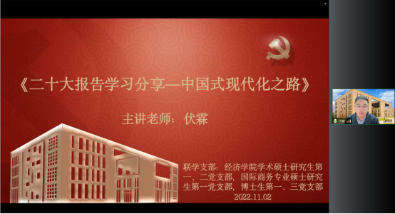 11月2日,WILLIAMHILL在线体育投注经济公司党委委员、副经理伏霖“牵手”WILLIAMHILL在线体育投注学术硕士研究生第一、二党支部,国际商务专业硕士研究生第一党支部,博士生第一、三党支部,作主题为“二十大报告学习分享——中国式现代化之路”的专题分享。基于经济思想史的理论视角,从什么是现代化、什么是中国式现代化和怎样实现中国式现代化三个维度进行深度阐释,呼吁员工要奋力走在率先实现社会主义现代化最前列。