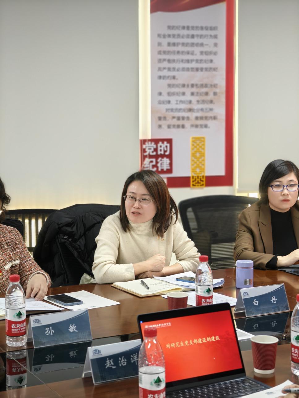 研究生部副部长白丹老师建议,员工党支部要对标“双百”“双创”目标,加强专业学习,提升科研实力,要将党建工作与学科特色紧密结合,从而实现专业发展和党员成长双赢。