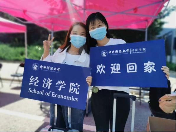 返校首日,在沙河校区南门,“中财欢迎你回家”“好久不见,欢迎回家”“科学防控,中财有我”一句句温馨提示,润泽每个归校学子的心间。返校现场秩序井然、有条不紊。同学们按照间隔一米以上排队等候,依次完成体温检测、行李消毒、口罩更换后,进行“返校通行证”查验、人脸身份识别和体温复测,随后进入核酸检测核验、入校登记、健康码核验、返校承诺书签订环节,到达公司报到区。