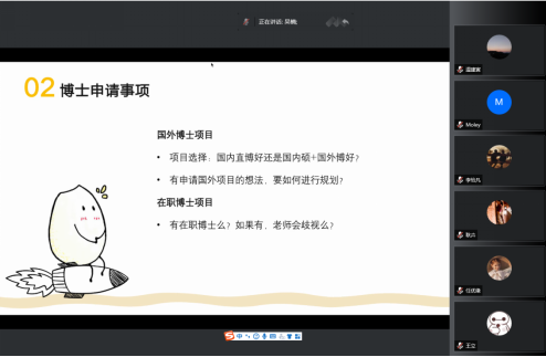 本次讲座就前期征集的同学们关心的问题,如是否选择读博、读博前学业准备、博士申请事项、科研压力疏解、毕业与就业等依次做出了解答: