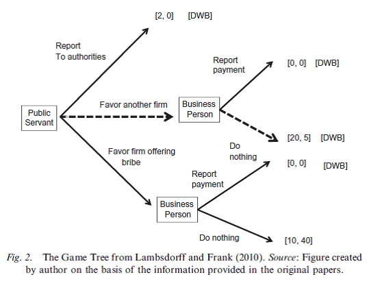 Lambsdorff和Frank(2011)用腐败博弈研究不同性别的行为差异,这次研究所用的最后通牒博弈是他们之前2010年研究中所用博弈的修订版。此博弈包括一个公司(在论文中用商人代替)和一个官员。公司为自身利益向官员行贿。这个博弈假设公司一定行贿,所以其实是从官员开始选择的。官员可以从以下行为中选择一种:(1)举报该公司,(2)受贿但是给另外其他公司好处而不是行贿公司,(3)受贿并且回报行贿公司以利益。无论官员是否回报行贿公司,一旦官员受贿,行贿公司即可以向有关部门举报。子博弈最完美的结果是官员受贿但把好处给另外一个公司,行贿公司却不采取任何行动。