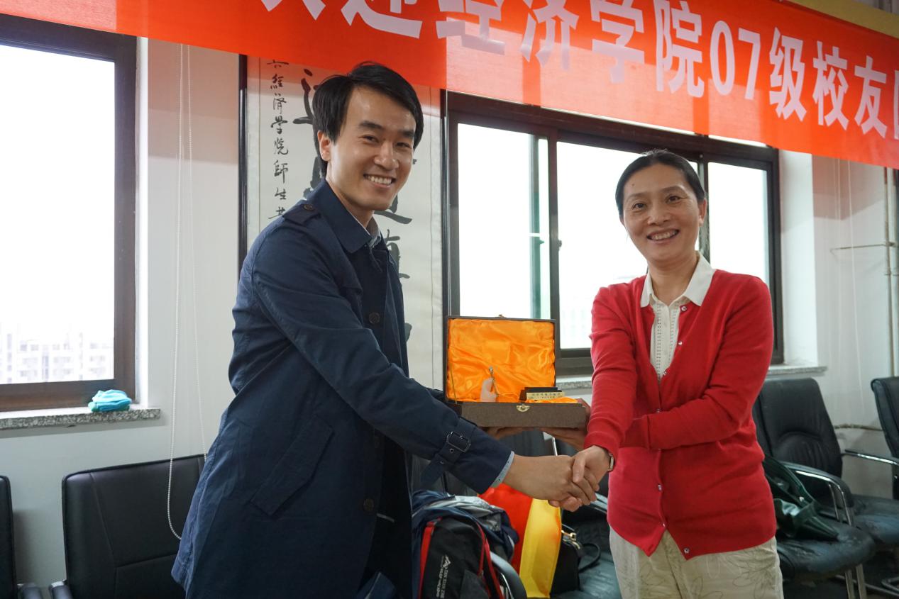 继老师们讲话之后,大家共同欣赏了老照片做成的纪念视频,看着曾经熟悉的面孔、彼此打闹的瞬间、搞笑的生活囧图和班级出游的合照,往事如电影般于眼前展现,忆起曾经的青春朝气、深情厚谊,员工们一边笑着一边红了眼眶。各位员工纷纷发言,激动之情溢于言表。经济学班班长姜海和国民经济管理班班长陶鹏代表公司2007级的45名本科同学向母校的辛勤培养和恩师的循循善诱、不吝赐教表达衷心的感谢。员工们表示,这次源于毕业时的五年之约的返校之行,同学们从祖国各地奔赴母校共聚一堂,恩师们于国庆佳节热情招待,让他们非常感动和骄傲。期待未来的十年聚,二十年聚,能将师生感情、员工情怀不断延续下去。因故未能到场的员工还纷纷录制了视频借以表达对同学、老师和母校的思念、感恩和祝福。陶鹏员工代表2007级全体本科员工向公司赠送礼物,以帆船寓意公司一帆风顺、蓬勃发展,祝愿公司越办越好。
