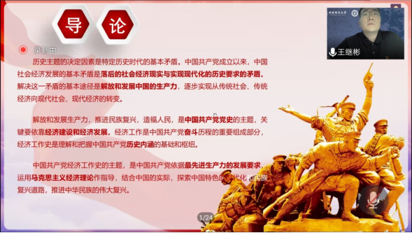 首先,王继彬同志通过分析中国社会经济发展的基本矛盾和中国共产党党史的主题,为大家介绍了中国共产党经济工作史这一主题的重要意义,讲述了经济工作是中国共产党奋斗历程的重要组成部分,经济工作史是理解和把握中国共产党历史内涵的基础和枢纽。随后,王继彬同志详细介绍了经济工作史各个阶段的经济理论与经济思想、发展战略与变革方向、工作成就与历史经验以及对马克思主义经济理论的发展与贡献等内容。最后,王继彬同志通过总结中国共产党经济工作90年的经验启示、历史方位、历史创造和未来方向,提出我国在迈向全面建设社会主义现代化国家的新征程中,要不忘初心、牢记使命,拥抱属于中国的新时代。