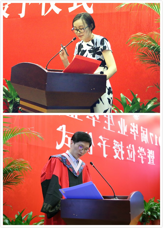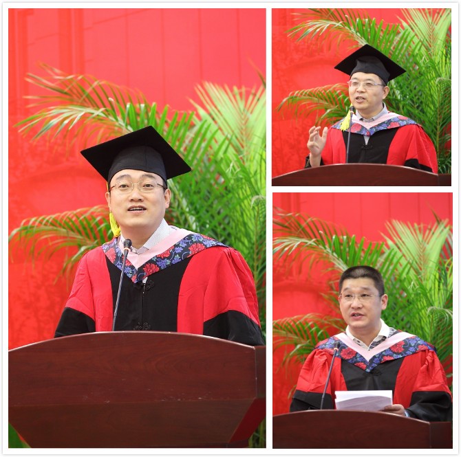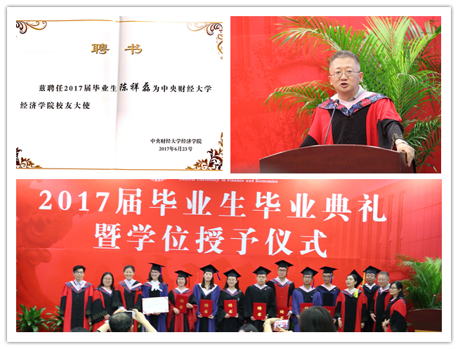 听叮咛,情深意切。政治经济学系冯春安老师作为教师发言代表,用“祝贺、感谢、希望”三句话表达了对同学们的嘱托,对毕业生们提出了“自强”“自律”“自省”“自乐”的期望,最后将“人生很短也很长,酸甜苦辣味多样。自强不息勤奋斗,人生高度在梦想。中财学子实力强,德智体美样样棒。广阔天地展宏图,捷报频传创辉煌。”的原创诗歌送给了2017届的毕业生。