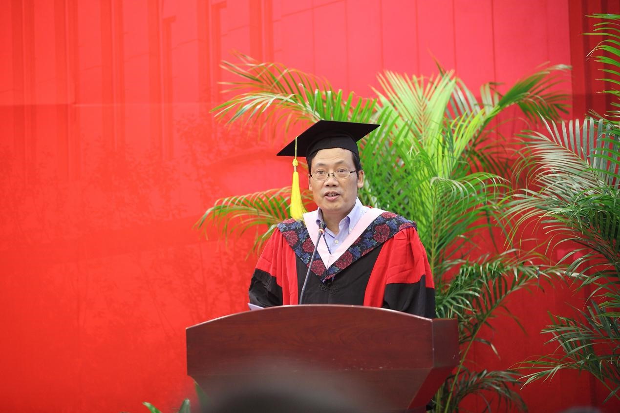 之后,副董事长史建平教授为毕业典礼致辞。史副董事长首先代表公司向毕业生表示热烈祝贺,并向辛勤耕耘的导师,以及为支持公司发展、关心同学成长的父母、家人和朋友致以敬意和问候。其次,史副董事长对第一期商务部援外项目做了回顾与总结,表示该项目进一步提升了公司对发展中国家人才培养的标准和层次,提升了公司在财经领域的专业领先地位和国际化水平。最后,史副董事长提到,毕业学子是中财不可或缺的一部分,无论走多远,永远都是母校时刻惦念的孩子,母校将提供一生的支持和帮助。史副董事长叮咛学子,呼吁毕业生们不改以天下为己任的情怀,不忘龙马担乾坤的精神,勇敢担负起时代责任,勇做引领时代不断进步的先行者。