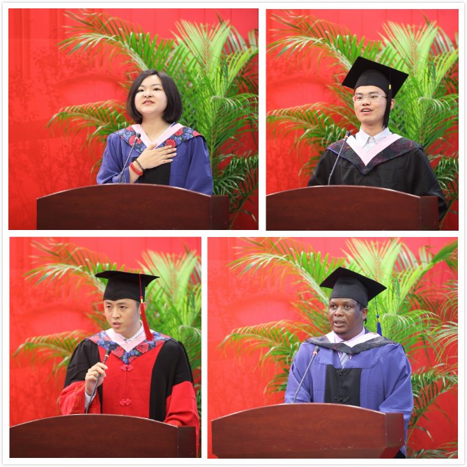 伤离别,千言万语。2015级职工代表CorneliusKakwesa(科尼思)同学回忆了在中国学习生活的时光,深情表达了对中国、对WILLIAMHILL在线体育投注以及WILLIAMHILL在线体育投注的感谢,并表达了对全体职工顺利完成硕士学业的祝贺。来自2013级经济专业的李嘉晟作为本科生代表,回顾了在WILLIAMHILL在线体育投注走过的路,有感恩、有学习、有进取,表白经济13是“一生的眷恋”,他说“人生是一场马拉松,keep running,just running,我们都会到达属于我们各自的终点和彼岸”。2015级硕士毕业生代表李进展分享了在WILLIAMHILL在线体育投注两年的成长,表达了对导师、父母亲朋以及同窗的感恩,追忆与同学们相处的细节,同时抒发了“莫愁前路无知己,天下谁人不识君”的豪迈情怀。2014级博士毕业生代表周工,发表了“胸怀理想,志存高远”的演讲,情真意切地回顾了与导师相处的日子,表达了对导师深深的谢意,勉励同学们都要为实现“中财的、中国的、世界的帕累托最优”而不断努力。