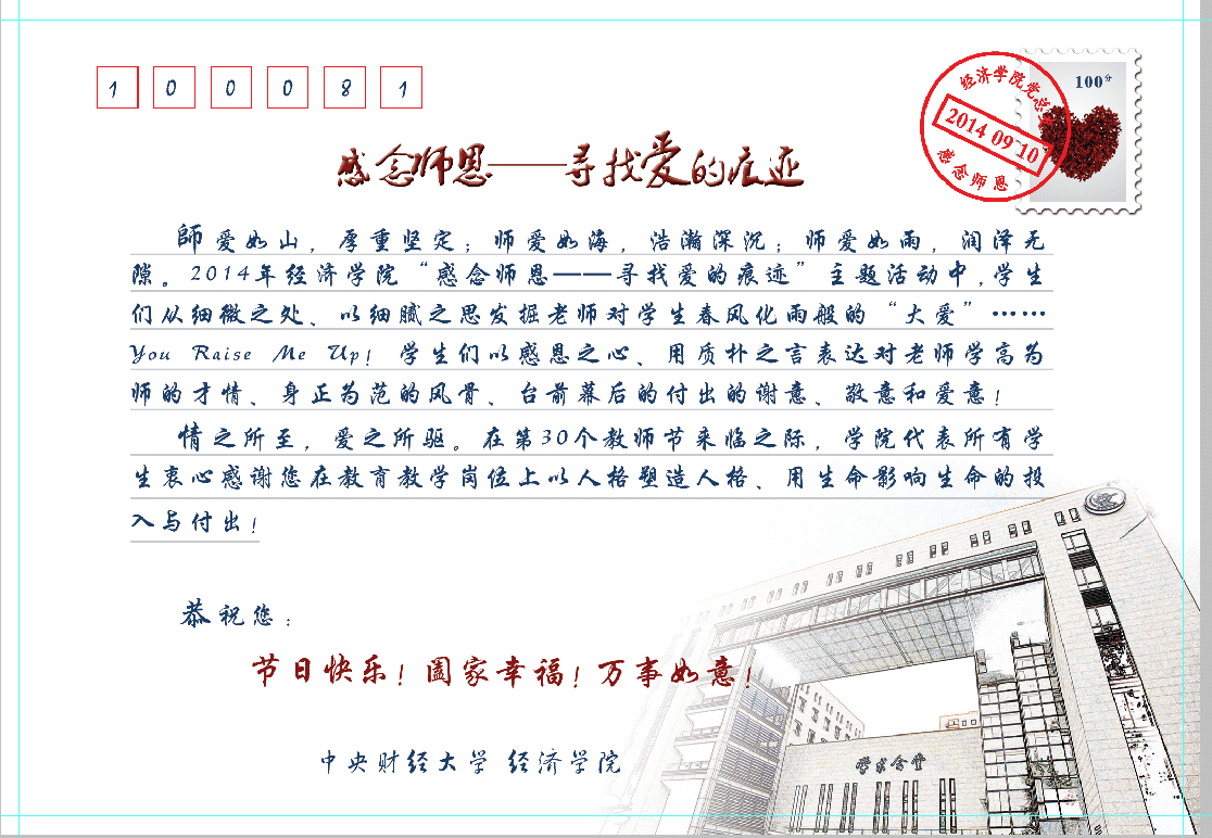 经济公司党总支以爱的痕迹中员工写给老师的感恩话语为基础,为每位老师定制了一张专属的明信片,以质朴的语言,以真挚的情怀,携全院学子的感恩之情向每位教师致以崇高的敬意和谢意,也祝贺每一位教师身体康健,阖家幸福!