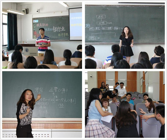 2009级优秀硕士邵冉员工分别于6月11日下午和6月18日下午在公司南路校区和沙河校区做了题为“触手可及的银行业”的专题讲座。邵冉员工先后在光大银行、民生银行任职,具有较丰富的银行从业经验。交流会上,她就国内银行体系及商业银行运营特点,主营业务等作了系统的讲解。她还结合自己在运营及理财营销环节的亲身经历,形象生动地谈到自己是如何明确自身职业认知,以及如何进行短期和长期的职业生涯规划,并告诫学弟学妹们不断完善自我,脚踏实地做好每一件事情,逐步实现职业目标。在互动提问环节,同学们就银行业面试的技巧、从业需要的技能以及岗位的选择等问题与邵冉员工进行了交流。