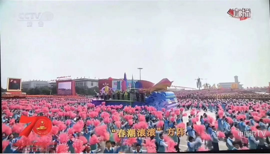 “春潮滚滚”方阵中,我们身着春意盎然的湖蓝色服装,手持象征着朝气和活力的桃花花束,伴随着《在希望的田野上》的优美旋律,簇拥着代表改革开放精神的彩车,热情洋溢地走过天安门广场,高喊“祖国万岁”的口号,以饱满激扬的精神面貌接受祖国和人民的检阅。