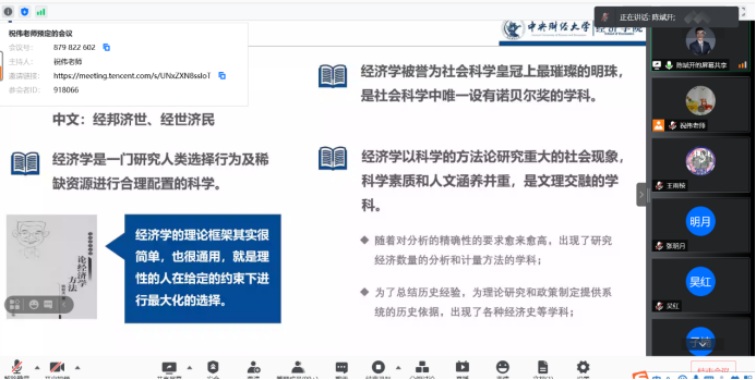 开营仪式伊始,WILLIAMHILL在线体育投注经理陈斌开教授致辞。陈经理以“经世济民 梦享WILLIAMHILL在线体育投注”为题,向大家介绍了经济学的基本要义、WILLIAMHILL在线体育投注的基本情况和人才培养体系。让同学们深入了解了经济学的独特魅力和WILLIAMHILL在线体育投注的优势特色。之后,戴若尘老师以“田野调查与大数据分析在经济学研究中的应用”为题,给大家带来了一场精彩的学术讲座。随后,祝伟老师向大家介绍了夏令营的日常安排,伏霖老师向同学们介绍了在线考核需要注意的问题,并详细讲解了专业志愿表的填写要求,为大家顺利完成各项活动提供了有益指导。