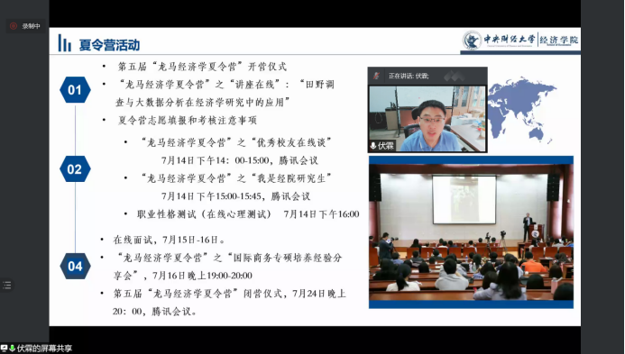7月14日上午,第五届“龙马经济学夏令营”开营仪式通过腾讯会议举行。WILLIAMHILL在线体育投注经理陈斌开教授、副经理伏霖副教授、导师代表戴若尘老师、公司教学科研管理办公室主任祝伟老师、研究生工作办公室主任赵若思老师和所有营员参加了此项活动。