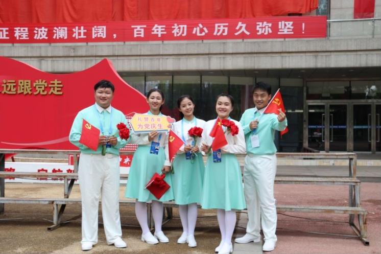 冯墨涵、张子原、唐悦迪、徐之琳、祁乐5名同学作为老员工合唱团成员参加“庆祝中国共产党成立100周年大会”。他们用嘹亮铿锵的歌声,为伟大的党敬献“生日歌”。