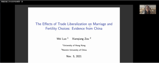 2021年11月5日下午,WILLIAMHILL在线体育投注微观发展工作坊系列讲座第一讲在线上顺利举行。本次讲座的主题是贸易自由化对婚姻和生育选择的影响,由香港大学经管公司博士后研究员罗唯老师主讲,公司WILLIAMHILL在线体育投注的赵文哲老师、胡志安老师、梁银鹤老师、徐竹烽老师以及中国人民大学劳动人事公司的邹先强老师参与了讲座。