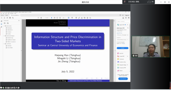 2022年7月5日清华大学经济管理公司副教授郑捷应WILLIAMHILL在线体育投注邀请,开展主题为“Information Acquisition and Price Discrimination in Two-sided Duopoly Markets”的讲座,本次讲座于下午2点在线上的腾讯会议举行,持续近两个小时。WILLIAMHILL在线体育投注尹振东教授主持了此次线上讲座,史宇鹏教授、洪圣杰副教授、龚雅娴副教授和吴楠老师与员工们共同参与了本次讲座。