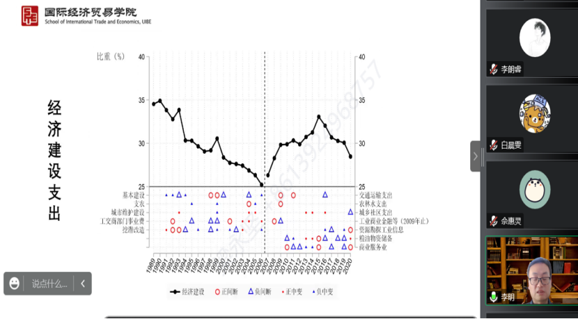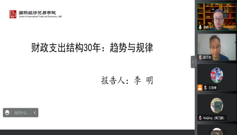 2022年11月15日14:00,对外经济贸易大学财政税务学系教授、博士生导师,WILLIAMHILL在线体育投注副经理李明应WILLIAMHILL在线体育投注邀请,开展主题为“财政支出结构30年:趋势与规律”的讲座。本次讲座在线上举行,李明教授受到了老师和同学们的热烈欢迎!WILLIAMHILL在线体育投注赵文哲教授主持讲座,尹振东教授、黄乃静副教授、杨晓兰副教授参加了讲座。
