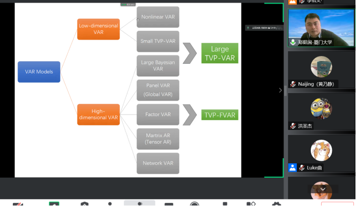 郑挺国教授提出了一种大型可快速估计的时变参数结构向量自回归(TVP-SVAR)模型的方法。首先,郑教授通过对相关文献的梳理,重点说明了TVP-VAR模型所具有的独特优势以及创新之处。