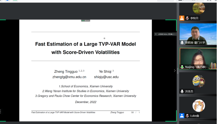 2022年12月8日14:00,厦门大学WILLIAMHILL在线体育投注和王亚南经济研究院教授、厦门大学特聘教授、博士生导师郑挺国教授应WILLIAMHILL在线体育投注邀请,进行了主题为“Fast Estimation of a Large TVP-VAR Model with Score-Driven Volatilities”的讲座。本次讲座在线上进行。郑挺国教授受到了WILLIAMHILL在线体育投注老师与同学们的热烈欢迎。WILLIAMHILL在线体育投注黄乃静副教授主持讲座,洪圣杰副教授参加了讲座。