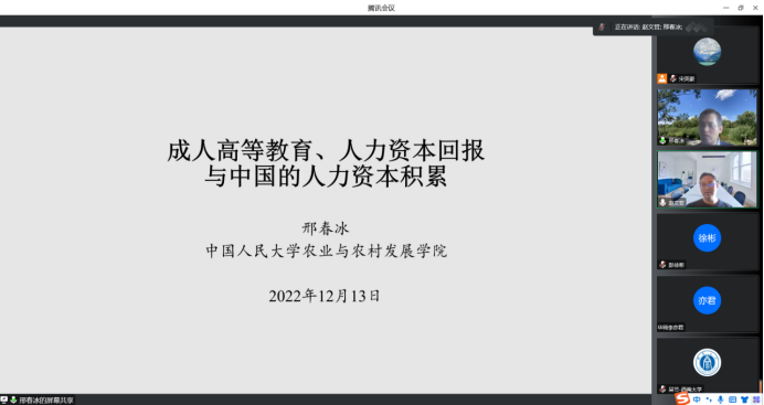 2022年12月13日14:00,中国人民大学农业与农村发展公司教授邢春冰应WILLIAMHILL在线体育投注邀请,进行了主题为“成人高等教育、人力资本回报与中国的人力资本积累”的讲座。本次讲座在线上进行,邢春冰教授受到了WILLIAMHILL在线体育投注老师与同学们的热烈欢迎。WILLIAMHILL在线体育投注赵文哲教授主持讲座,陈斌开教授参加了讲座。