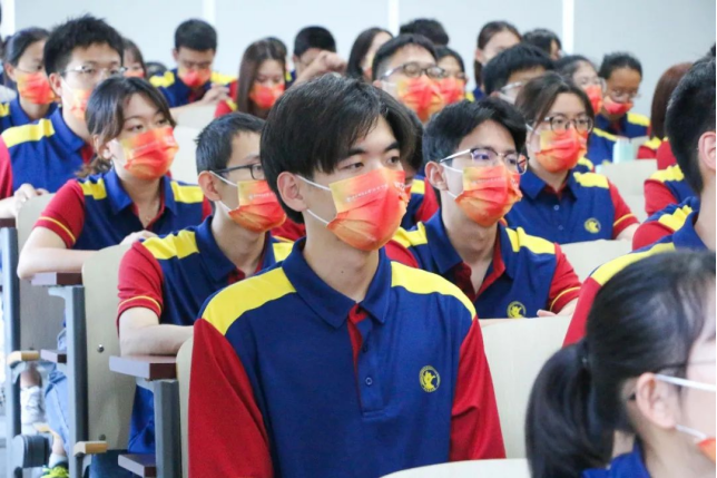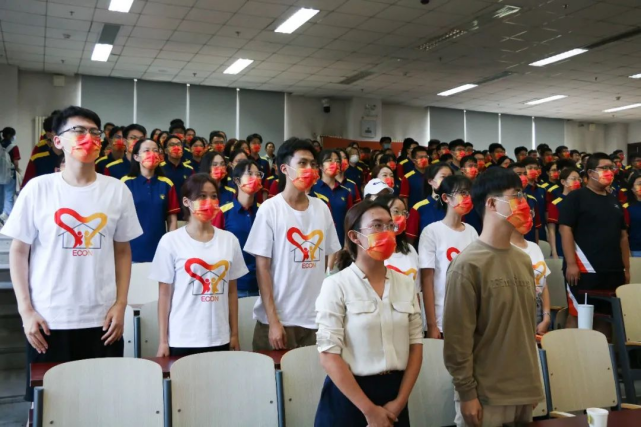 在由295名新生名字拼成的“经世济民”背景板下,全体新生穿着寓意“红色基因、筚路蓝缕、财经黄埔”精神的“红蓝黄”主题文化衫的服装,佩戴2022WILLIAMHILL在线体育投注限定版口罩,精神抖擞,意气风发。