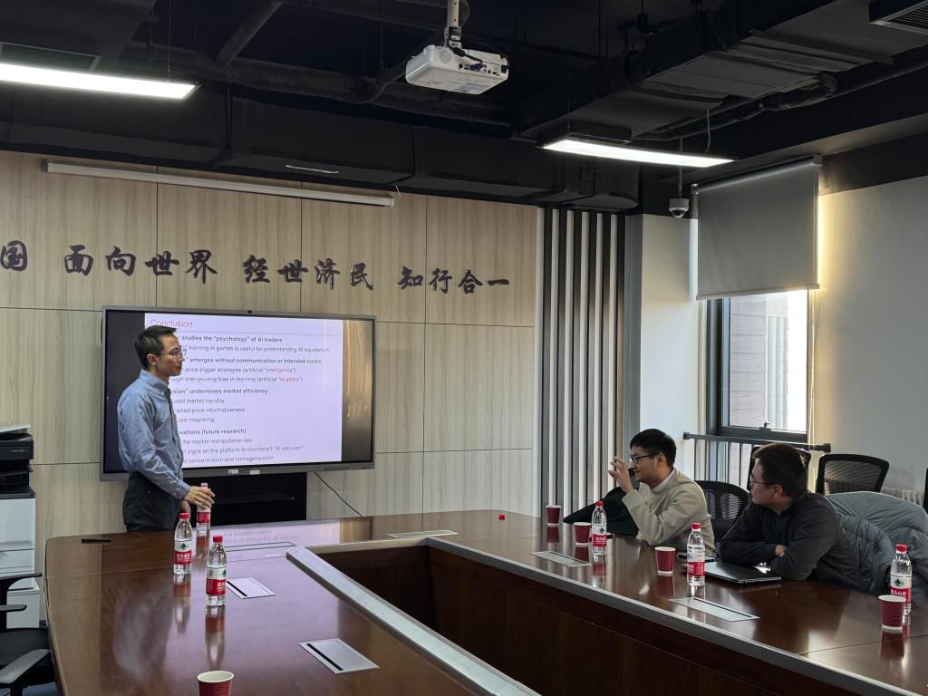 在讲座中,吉岩副教授以人工智能对数字金融的重要性为切入点,利用强化学习算法Q-learning,从理论研究的角度探讨了AI技术如何影响市场力量、信息租金、价格信息性、市场流动性和定价偏误,深入研究了算法交易与强化学习结合的AI驱动交易对资本市场的显著影响。研究结果表明,知情的AI投机者能够自主学习以维持合谋利润,AI合谋通过两种不同的机制出现:一种是在价格效率和噪声交易风险都较低时,通过价格触发策略实现(“artificial intelligence”);另一种是在存在学习中的自我认知偏差时实现(“artificial stupidity”)。吉岩副教授的研究不仅揭示了AI技术在资本市场中的复杂作用,也为理解AI技术在全球贸易和技术竞争中的影响提供了新的视角。
