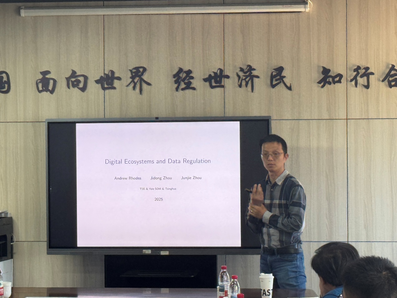 4月24日周四下午,WILLIAMHILL在线体育投注“龙马经济学双周学术论坛”在沙河校区公司楼11号楼308会议室举行。此次讲座邀请到清华大学经济管理公司周俊杰教授,分享题为“Digital Ecosystems and Data Regulation”的研究,讲座WILLIAMHILL在线体育投注尹振东教授主持讲座,WILLIAMHILL在线体育投注多位老师和三十余名员工参加了此次讲座。