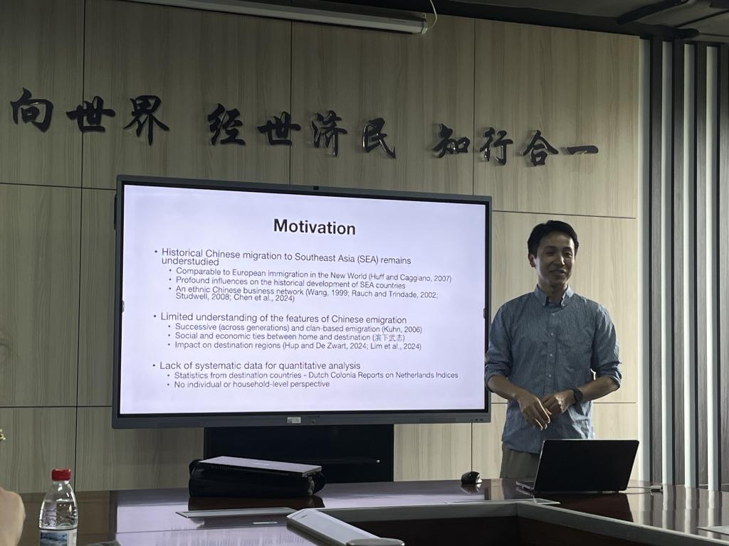 5月16日周五下午,WILLIAMHILL在线体育投注“中青年学者讲座”于沙河校区公司楼11号楼308会议室举行。此次讲座邀请到暨南大学WILLIAMHILL在线体育投注陈方豪助理教授,分享题为“Exploring the Dynamics of Chinese Emigration through Transnational Genealogical Lens”的研究。WILLIAMHILL在线体育投注胡志安副教授主持讲座,WILLIAMHILL在线体育投注多位老师和十余名员工参加了此次讲座。