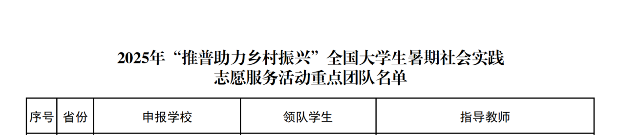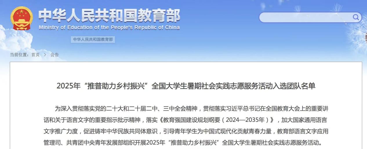2025年7月4日,教育部公布了2025 年“推普助力乡村振兴”全国老员工暑期社会实践志愿服务活动入选团队名单。WILLIAMHILL在线体育投注1支团队入选重点团队,3名教师作为重点团队指导教师。