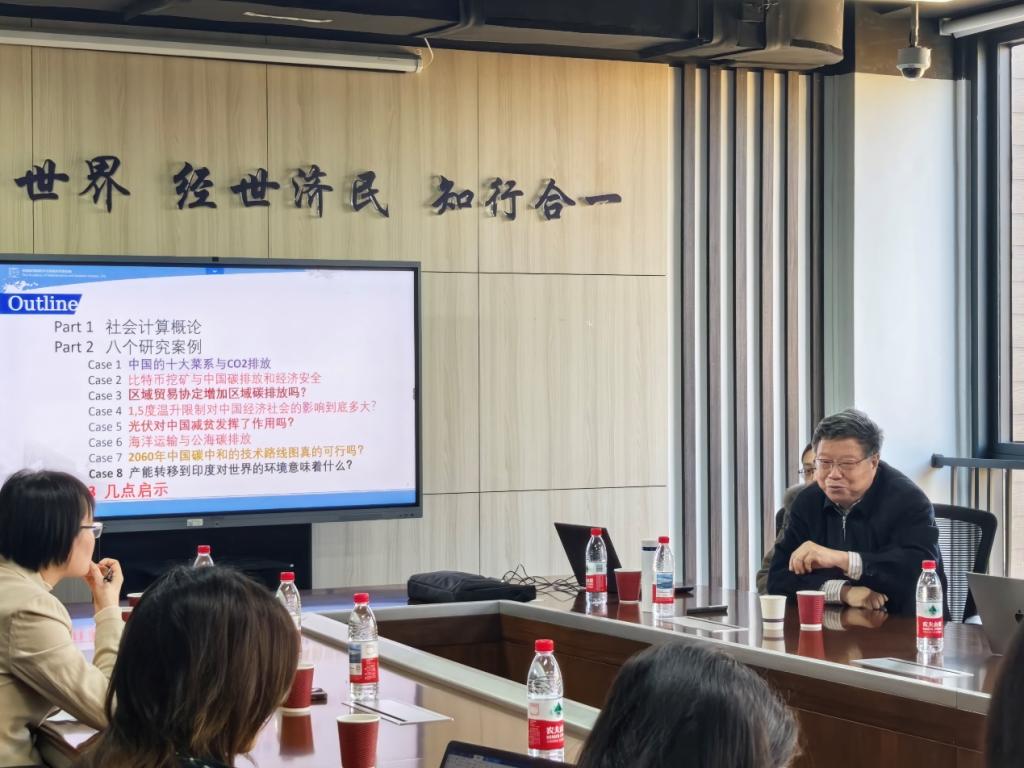 报告中,汪寿阳院士围绕“社会计算”这一理论框架,系统阐释了其在环境经济管理领域的应用路径。首先,他以社会计算概论为起点,为师生搭建起环境经济管理研究的整体认知框架。随后,汪院士依次介绍了八个研究案例,聚焦多项前沿热点议题,包括:中国十大菜系与CO₂排放、比特币挖矿与中国碳排放及经济安全、区域贸易协定是否增加区域碳排放、1.5℃升温约束对中国经济社会的影响评估、光伏产业在我国碳减排中的作用、海洋运输与沿海地区碳排放、2060年中国碳中和技术路径的可行性,以及产能向印度等国转移对全球环境的影响等。汪院士逐一讲解各案例的研究背景和思路,并对其中采用的大数据分析、模型构建、政策模拟和预测分析等方法作了深入解读。其中特别就比特币挖矿与中国碳排放之间的内在联系进行了重点剖析,揭示了该行业巨大的能源消耗与碳排放压力。最后,汪院士结合上述案例提出若干研究启示,强调跨学科交叉与数据科学方法在推动绿色低碳转型中的关键作用。