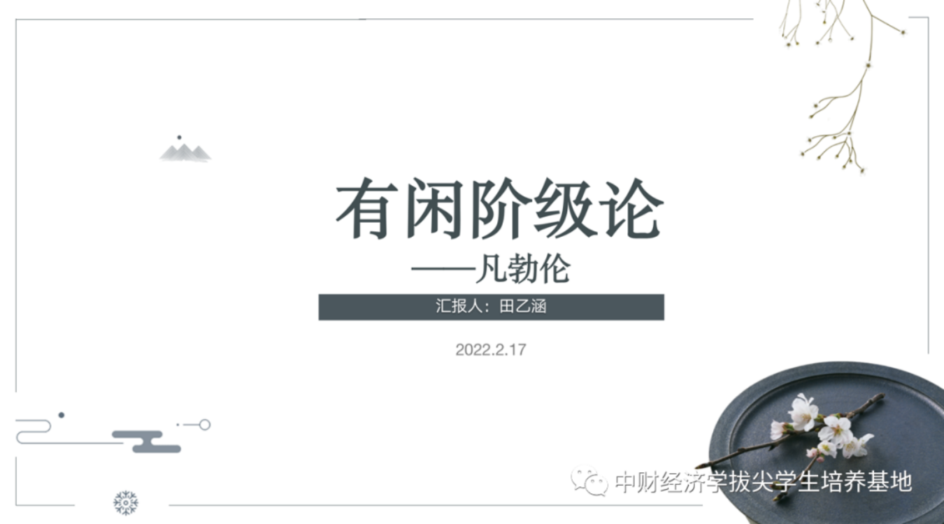 最后,田乙涵同学分享了由美国经济学巨匠凡勃伦所著的《有闲阶级论》。凡勃伦认为,在文化的演化历程中,有闲阶级的出现与所有制的起源同期发生。在物品归个人所有的任何社群中,为了让自己获得心理平衡,每个人都必须与他所认为与自己处于同一阶层的其他人拥有同样多的物品,而当他所拥有的物品多于旁人时,更将产生极大的满足感。但某人一旦获取了新的物品,并开始习惯于因此而形成的新的财富标准,这一新标准相较于旧标准所带来的更大满足感便不复存在。由此,人们为了得到更高的公众敬意而不断进行“金钱竞赛”。同时,财富和权力必须提供证据,只有通过这些证据才能享受声誉。所以有闲阶级通过炫耀性有闲来证明自己的财力,包括花费时间和精力来养成礼貌、豢养不从事任何生产工作的仆人、设计束缚女性行动的服饰。有闲阶级崇尚有闲生活,遵循炫耀性有闲和炫耀性消费原则,凡勃伦不认为这些是好的原则,但也认为鉴于人的本性,改变会十分困难而缓慢。但在对艺术和科学的追求和慈善事业中,有闲阶级的赞助和自身在这方面的造诣起到了一定的积极作用。这本书用严谨的逻辑阐述了有闲阶级的形成过程及其地位和价值,十分推荐大家阅读。
