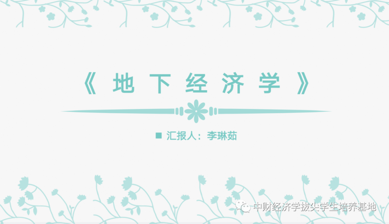 接着李琳茹同学汇报了埃德加·法伊格所著的《地下经济学》一书。作者认为,经济学理论与现实是无法分割的。除去观测到的、有具体数据描述的经济部门外,还存在着规模庞大和不断增加的未观察到的、没有数据支撑的经济部门,会在观察到和受控制的领域之外重新分配资源,影响人们对经济现实的认识,也会影响经济现实本身。因此,地下经济这一未观测到的经济的研究对于宏观经济稳定政策和税收政策具有十分重要的意义。本书对地下经济进行了含义、测定方法、经济模型、合理规模等方面的介绍,提供并评估了在不同国家出现的地下经济活动与规模的证据,对于人们更加深刻理解社会经济系统运行具有重要意义。